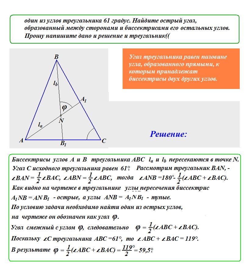 один из углов треугольника 61 градус. Найдите острый угол, образованный между сторонами и биссектрисами его остальных углов.