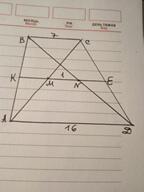 КЕ проходит через середины диагоналей трапеции, значит КЕ - средняя линия трапеции, КЕ=(ВС+АD):2=11,5 см