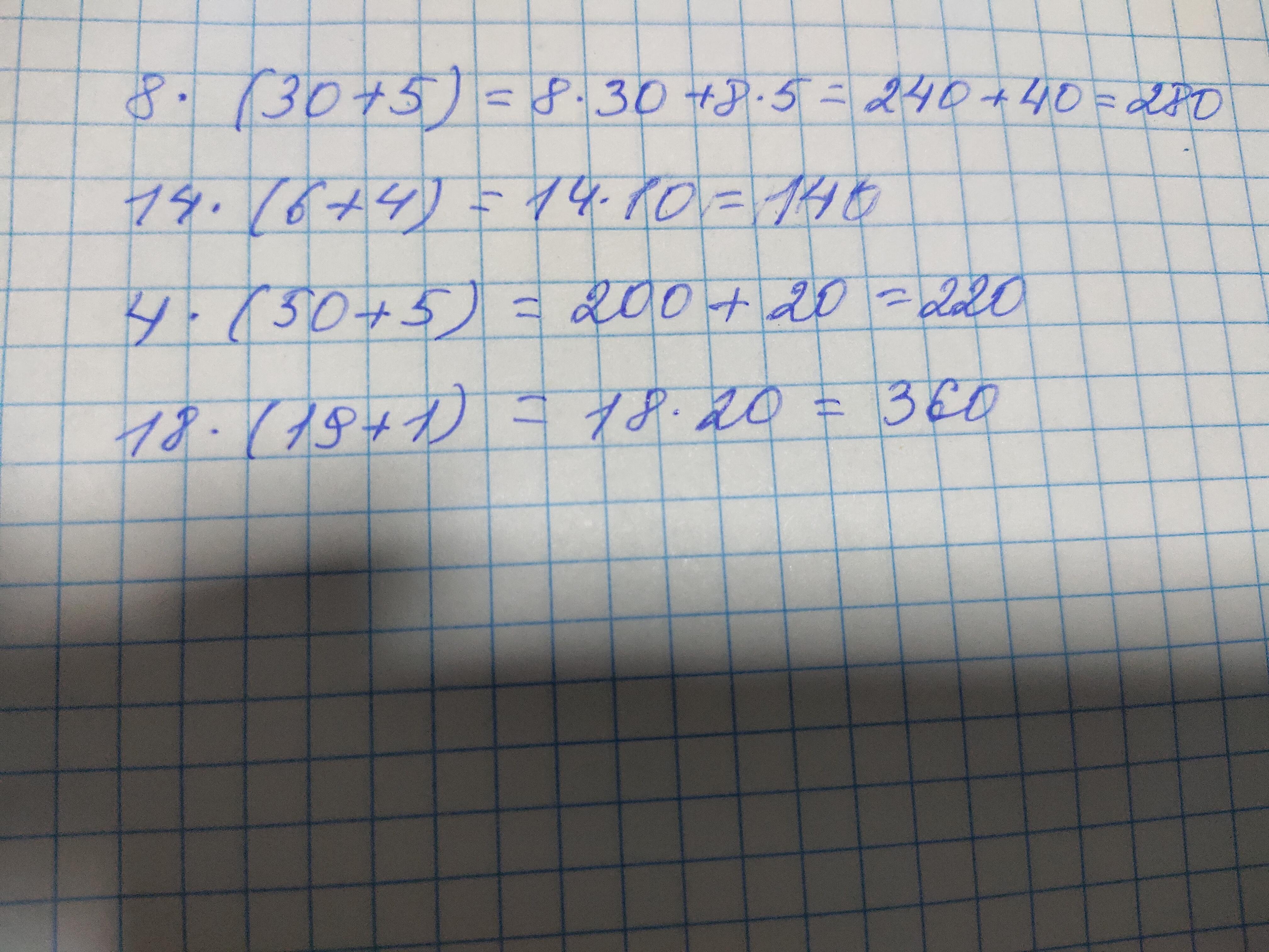 СРОЧНО ПЖ ВЫЧИСЛИТЕ УДОБНЫМ СБОСОБОМ 8•(30+5)= 14•(6+4)= 4•(50+5)= 18•(9+1)=
