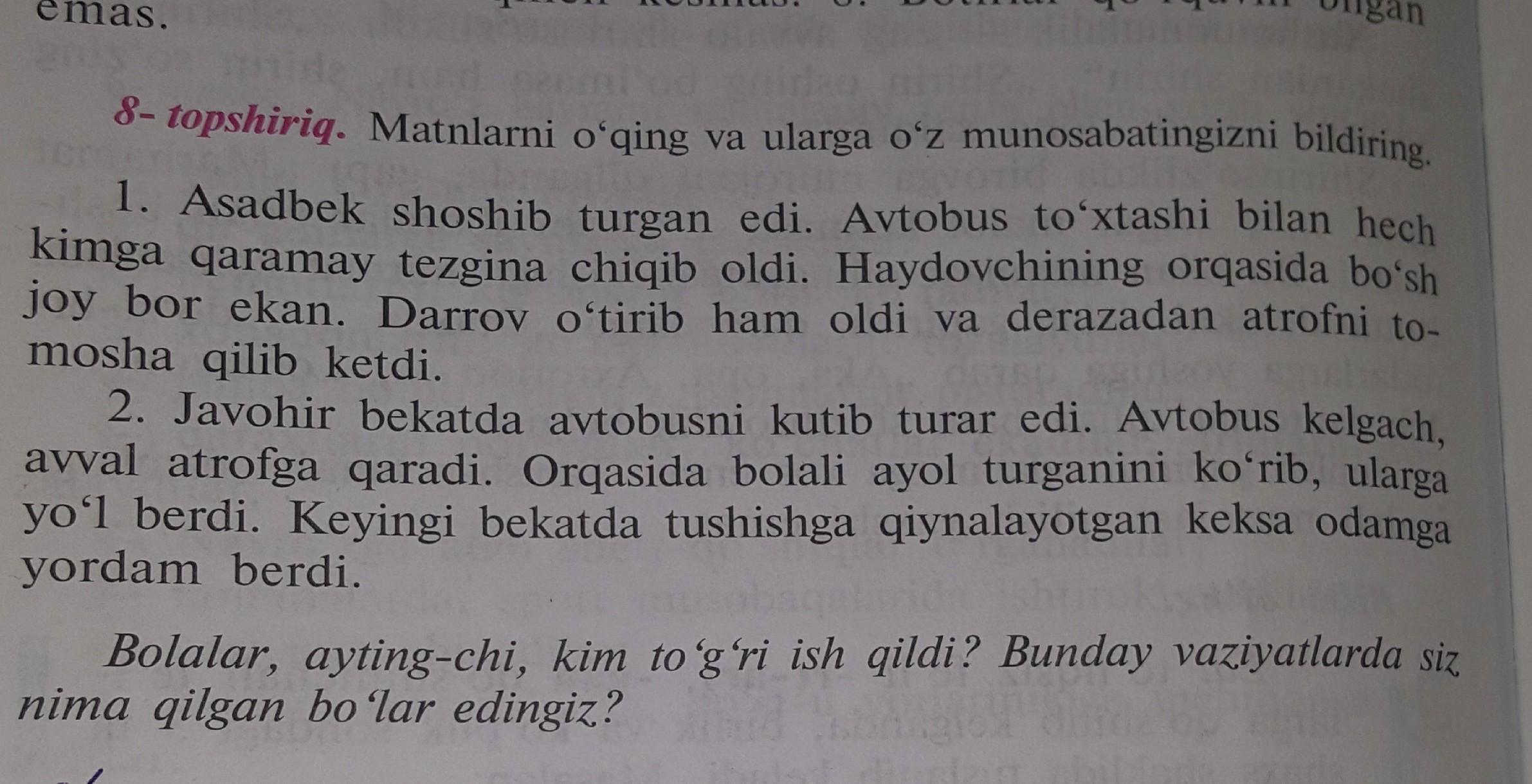 Albatta, Javohir to‘g‘ri qildi. U odamlarga yordam berdi, avtobusdan tushishga qiynaliyotgan keksa odamga, bolali ayolga. Hammasi ota-onaning tarbiyasiga bog'liq.