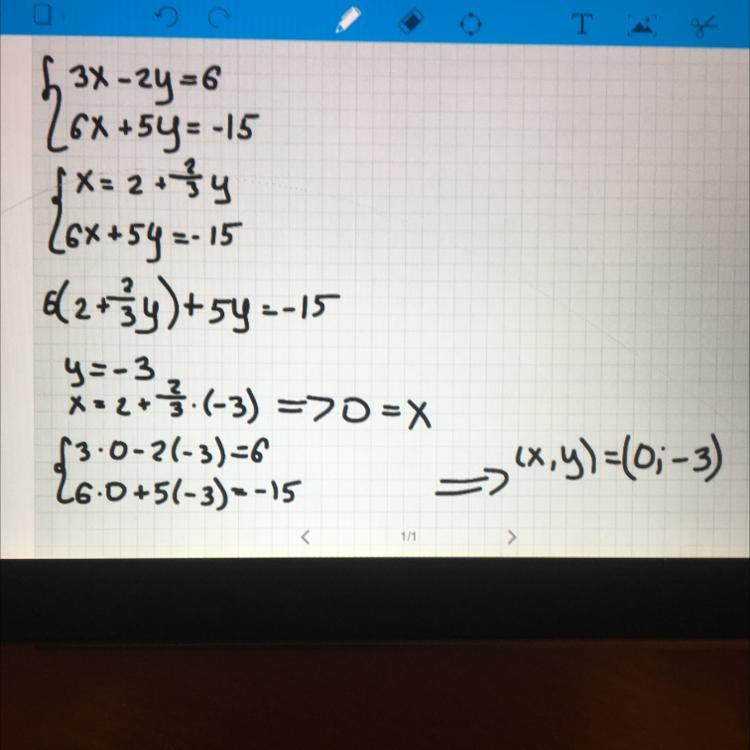 Первое уравнение умножим на -2 и сложим два уравнения получим 9у=-27, у=-3, подставим -3 в первое уравнение получим 3х-15=-15, 3х=0, х=0
