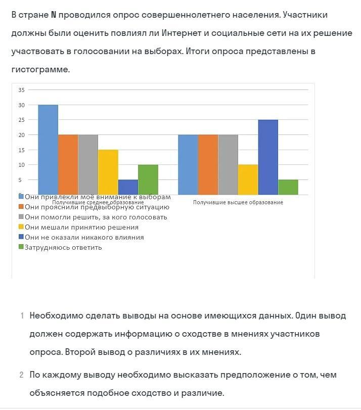 Получившие среднее образование и получившие высшее образование считают, что интернет и социальные сети прояснили предвыборную ситуацию. Можно предположить, что в стране N хорошо развита информационная осведомленность населения. Это доказывает то, что проголосовавшие смогли принять своё решение на основе информации из социальных сетей.