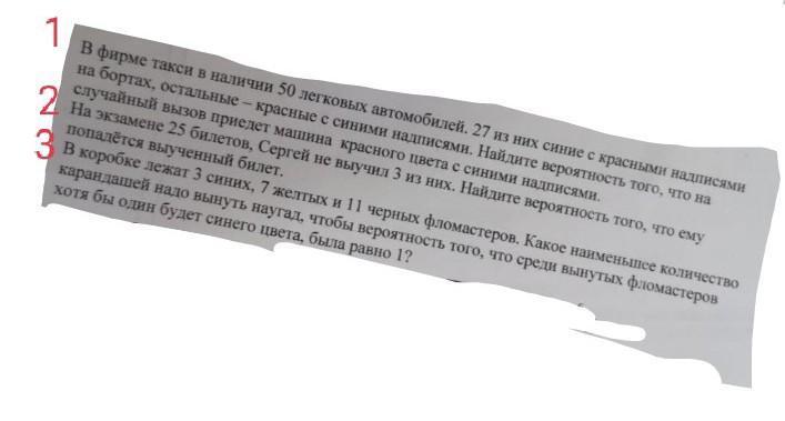 1) 50 - 27 = 23 жёлтые с чёрными надписями.2) 23 : 50= 0,46 Вероятность того, что на случайный вызов приедет машина жёлтого цвета с чёрными надписями равна 0,46