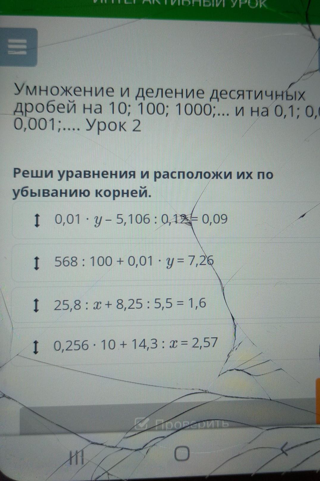 Умножение и деление десятичных дробей на 10; 100; 1000;... и на 0,1; 0,01, 0,001;.... Урок 2 Реши уравнения и расположи их по убыванию корней. I 0,01 · Y - 5,106:0,12= 0,09 1 568: 100 + 0,01 - y = 7,26 I 25,8: 2 + 8,25 : 5,5 = 1,6 І 0,256 - 10 + 14,3 х = 257