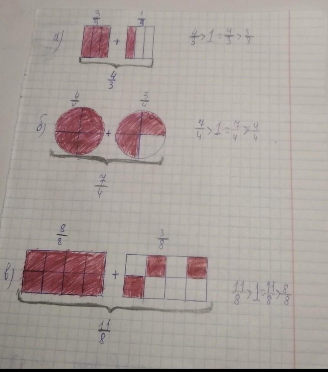 4 Выполни задание. Запиши в виде суммы дробей общее количество долей на каждом рисунке. Сравни их с единицей. Запиши неравенства a) 6) ? ? в) ?