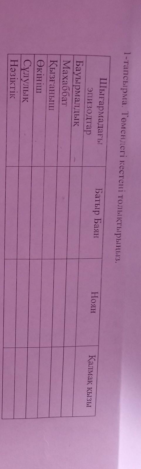 1-тапсырма. Төмендегі кестені толықтырыңыз. Батыр Баян Ноян Қалмақ қызы Шығармадағы эпизодтар Бауырмалдық Махаббат Кызганыш Өкініш Сұлулық Нәзіктік