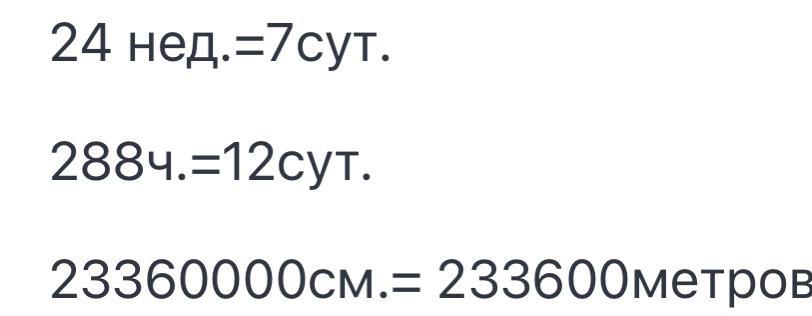 7 Вырази в указанных единицах измерения. = = 24 нед. = сут. 288 ч= Осут. 23 360 000 см = 500 км = Осм 5 000 мг = Ог 123 м2 = 0 см2 13 000мм3 = 0 см3 45 000 км = Ом 230 т = О кг 12 г= 0мг - Ом =