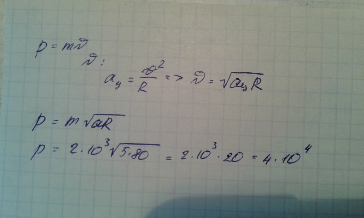 Автомобиль массой 2 тонны начинает движение по дуге окружности радиусом 80 м. Определитель импульс автомобиля, если его центростремительное ускорение равно 5 м/с^2
