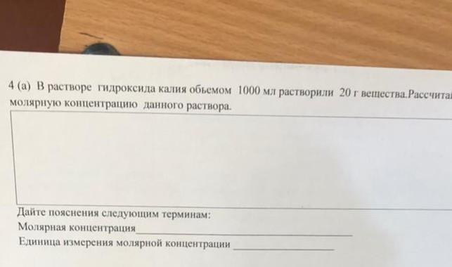 4 (а) в растворе гидроксида калия обьемом 1000 мл растворили 20 г вещества.Рассчитайте молярную концентрацию данного раствора