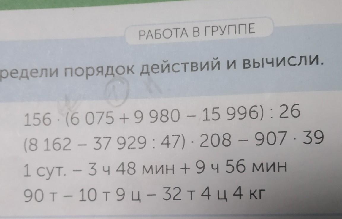 Определи порядок действий и вычисли. 156 · (6 075 + 9 980 - 15 996):26 (8 162 - 37 929: 47) 208 - 907.39 1 сут. – 3ч 48 мин + 9ч 56 мин 90 т – 10 т9ц – 32 т 4 ц4 кг