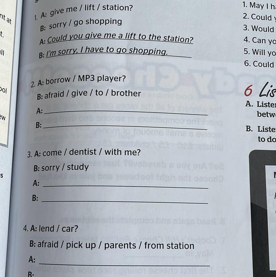 Write requests and then write answers refusing and giving an excuse with have to. Use the prompts given
