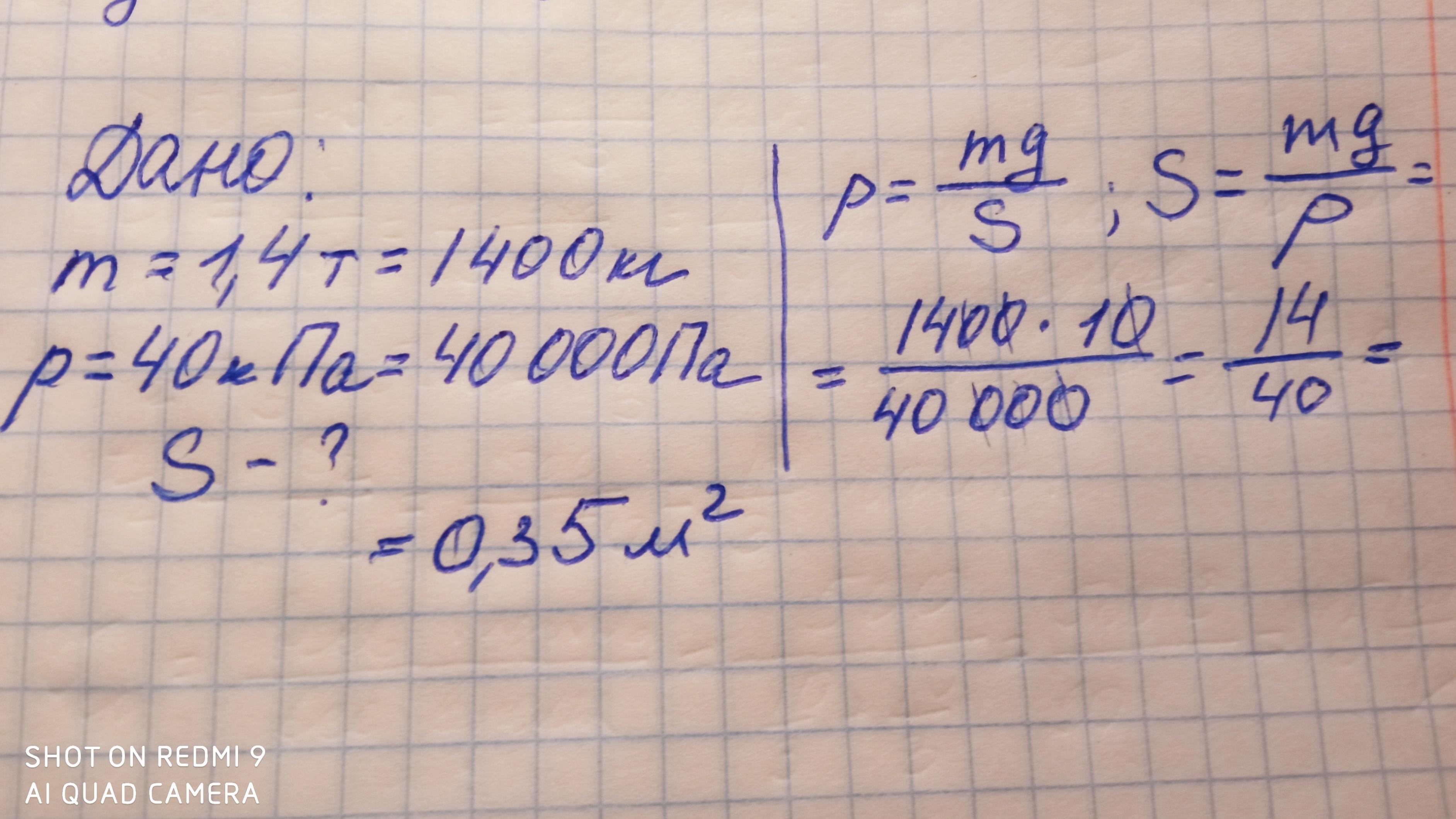 определите площадь соприкосновения колес автомобиля с поверхностью дороги, если его масса 1,4т. Давление которое оказывает автомобиль на поверхность равно 40 кПа