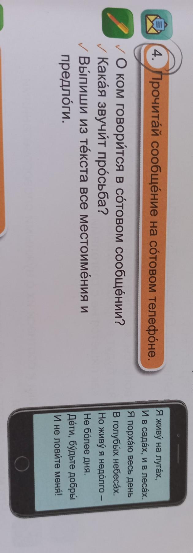 4. Прочитай сообщение на сотовом телефоне. О ком говорится в сотовом сообщёнии? Какая звучит просьба? Выпиши из текста все местоимёния и предлоги.
