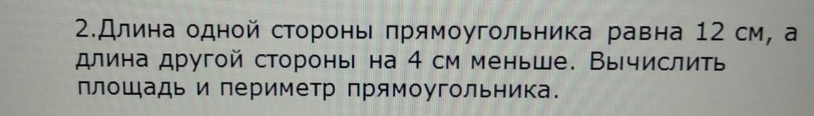 длина одной стороны прямоугольника равна 12см,а длина другой стороны на 4см меньше.вычеслить площадь периметр и прямоугольника