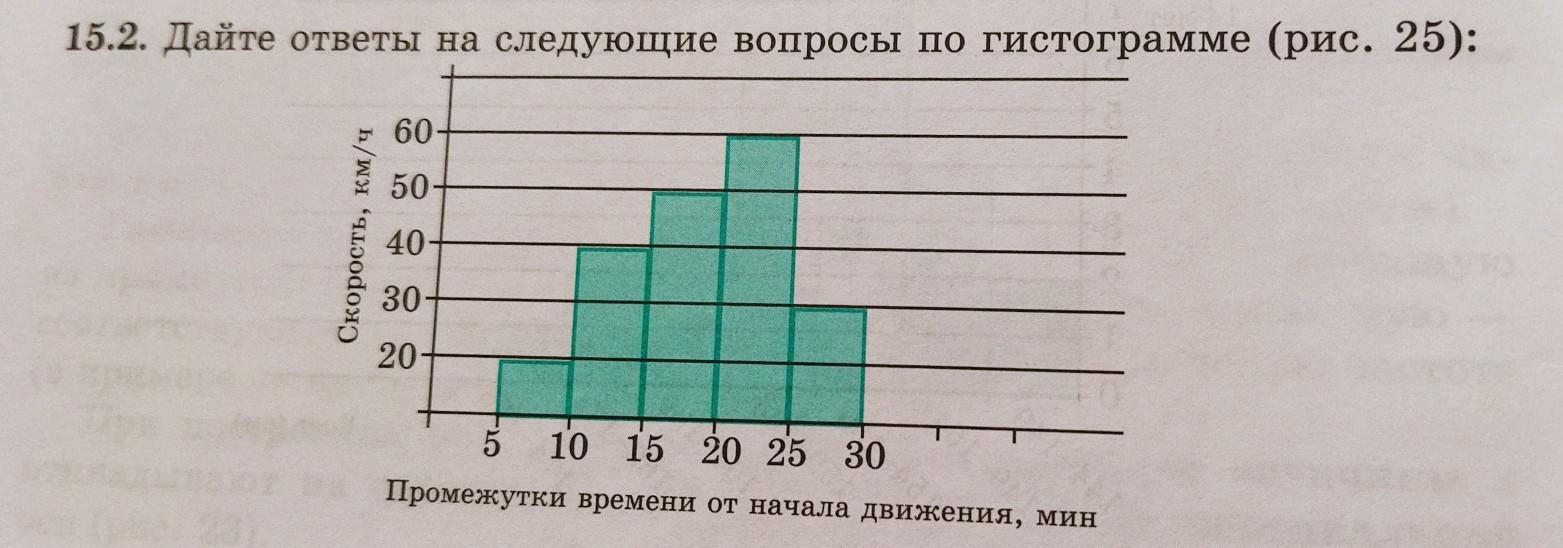 2)В какой промежуток времени после начала движения скорость машины была: а) 60 ки/ч б) 30 км/ч? На какие вопросы можно еще получить ответ по этой гистограмме?