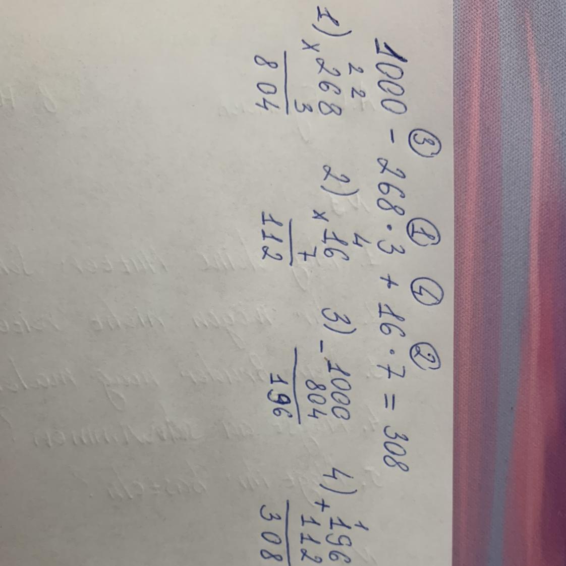 1000-268*3+16*7 запиши по действиям столбиком вычисли