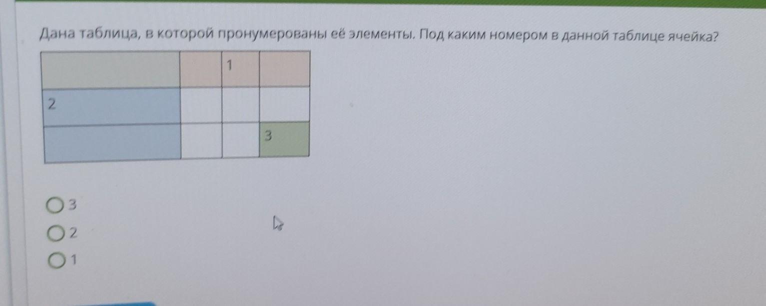 Дана таблица, в которой пронумерованы её элементы. Под каким номером в данной таблице ячейка? 1 2 3