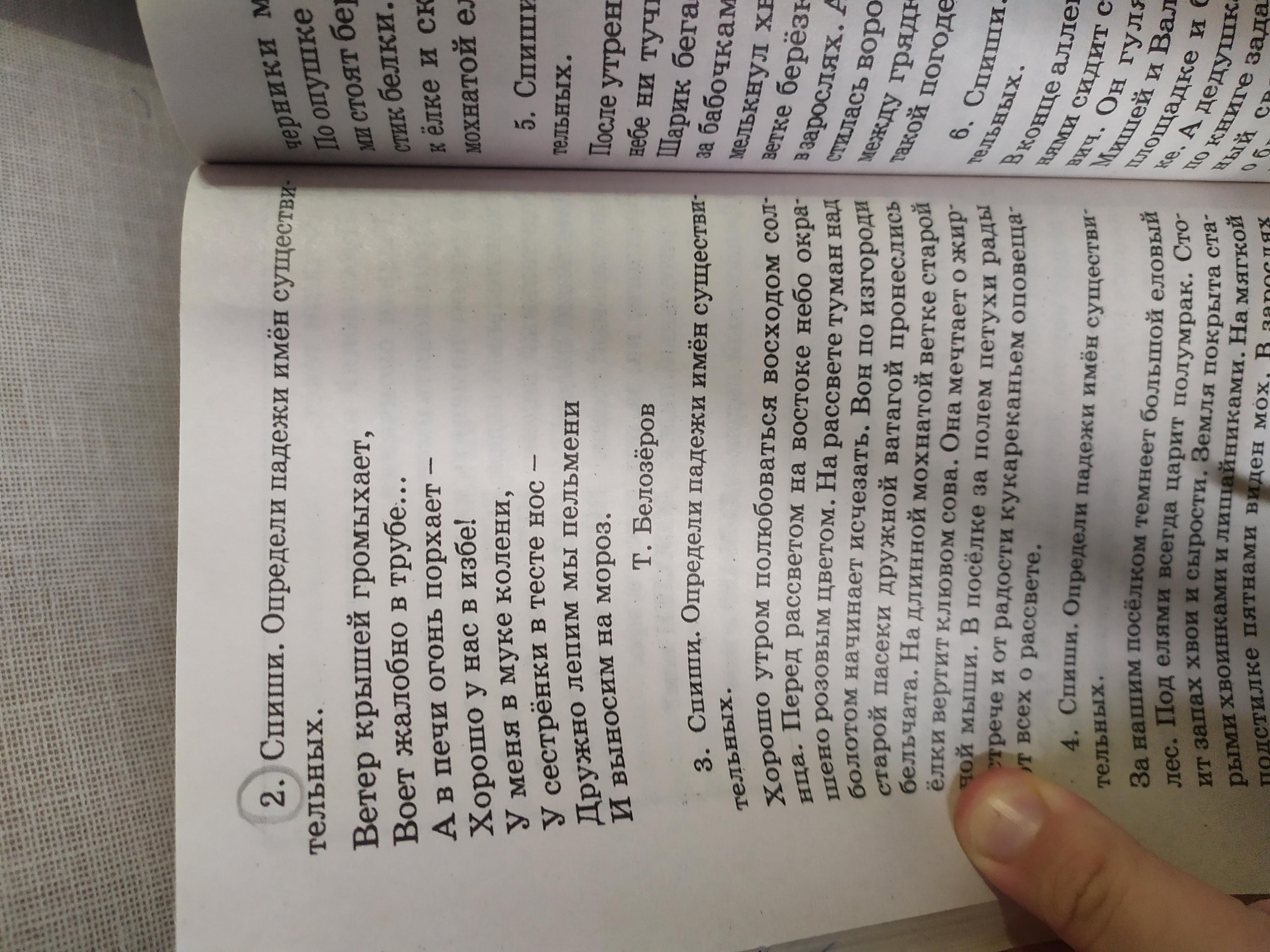 Ветер (что?) именительный падеж, крышей (чем?) творительный падеж, в трубе (о чём?) предложный падеж (предлог в), в печи (о чём?) творительный падеж (предлог в), огонь (что?) именительный падеж, в избе (о чём?) творительный падеж (предлог в), в муке (о чём?) творительный падеж (предлог в), колени (что?) винительный падеж, у сестрёнки (кого?) родительный падеж, в тесте (о чём?) творительный падеж (предлог в), нос (что?) винительный падеж, пельмени (что?) винительный падеж, на мороз (что?) винительный падеж.