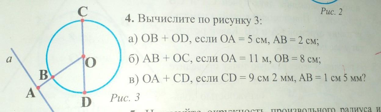 С Рис. 2 4. Вычислите по рисунку 3: а) OB + OD, если OA 5 см, AB = 2 см; б) АВ + OC, если OA - 11 м, OB = 8 см; в) OA + CD, если CD = 9 см 2 мм, АВ = 1 см 5 мм? а B A D Рис. 3 5. Нарисуйте окружность произвольного радиуса ТІ коны Тка
