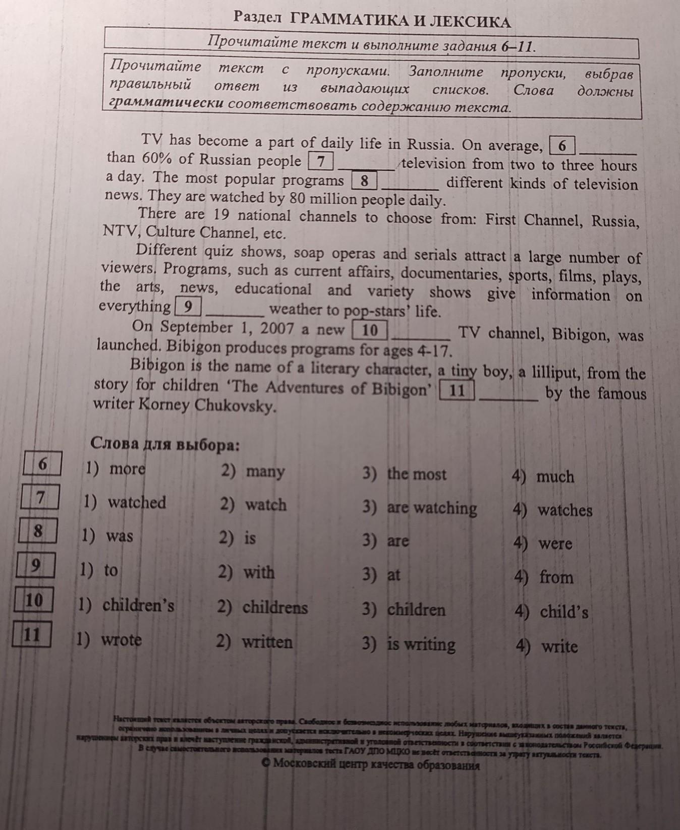Раздел ГРАММАТИКА И ЛЕКСИКА Прочитайте текст и выполните задания 6-11. Прочитайте пропусками. Заполните пропуски, выбрав правильный выпадающих Слова должны грамматически соответствовать содержанию текста. текст с omnem 113 списков. TV has become a part of daily life in Russia. On average, 6 than 60% of Russian people 7 television from two to three hours a day. The most popular programs 8 different kinds of television news. They are watched by 80 million people daily. There are 19 national channels to choose from: First Channel, Russia, NTV, Culture Channel, etc. Different quiz shows, soap operas and serials attract a large number of viewers. Programs, such as current affairs, documentaries, sports, films, plays, the arts, news, educational and variety shows give information on everything 9 weather to pop-stars' life. On September 1, 2007 a new 10 TV channel, Bibigon, was launched. Bibigon produces programs for ages 4-17. Bibigon is the name of a literary character, a tiny boy, a lilliput, from the story for children 'The Adventures of Bibigon' 11 by the famous writer Korney Chukovsky. Слова для выбора: 1) more 2) many 6 3) the most 4) much 7 1) watched 2) watch 3) are watching 4) watches 8 1) was 2) is 3) are 4) were 9 3) at 4) from 10 1) to 2) with 1) children's 2) childrens 1) wrote 2) written 3) children 4) child's 11 3) is writing 4) write
