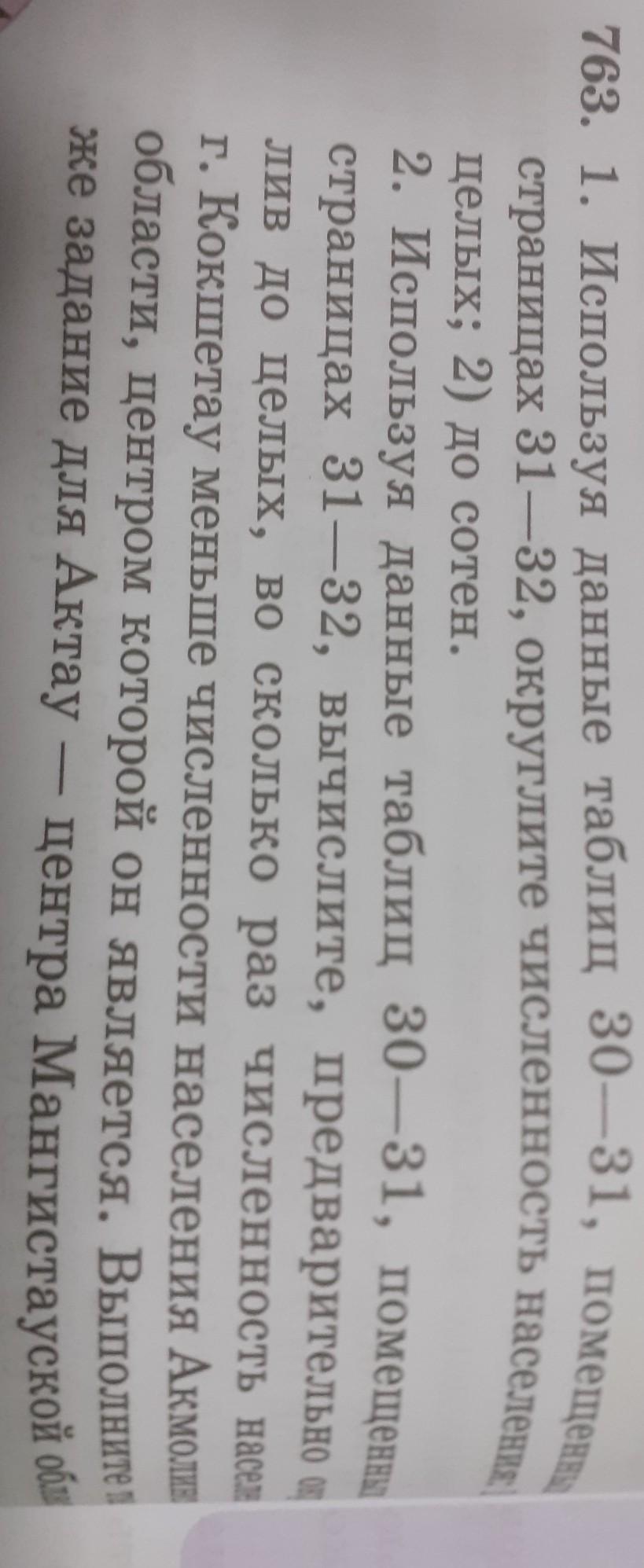 763. 1. Используя данные таблиц 30—31, помещенных на страницах 31 — 32, округлите численность населения: 1) до целых; 2) до сотен. 2. Используя данные таблиц 30—31, помещенных на страницах 31 — 32, вычислите, предварительно округ- лив до целых, во сколько раз численность населения г. Кокшетау меньше численности населения Акмолинской области, центром которой он является. Выполните такое же задание для Актау. центра Мангистауской области. 14