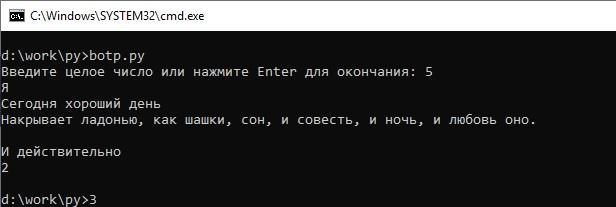 line = input("Введите целое число или нажмите Enter для окончания: ")