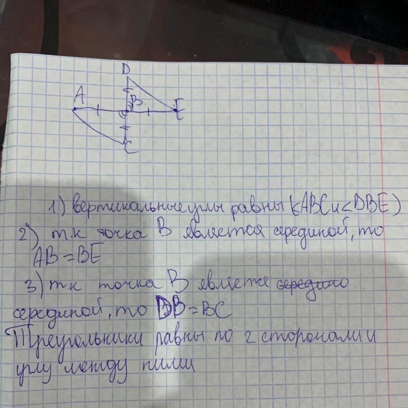 Помогите пожалуйста по геметрии отрезки АЕ и DC пересекаются в точке В, являющейся серединой каждого из них. Докажите, что треугольники АВСи ЕВD равны.