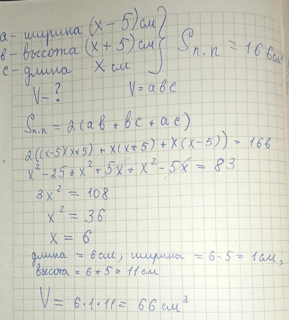 В прямоугольном паралелепипеде ширина меньше длины на 5 см, а высота батыме аины на 5 см. Площадь полной поверхности параллелепипеда равна 166