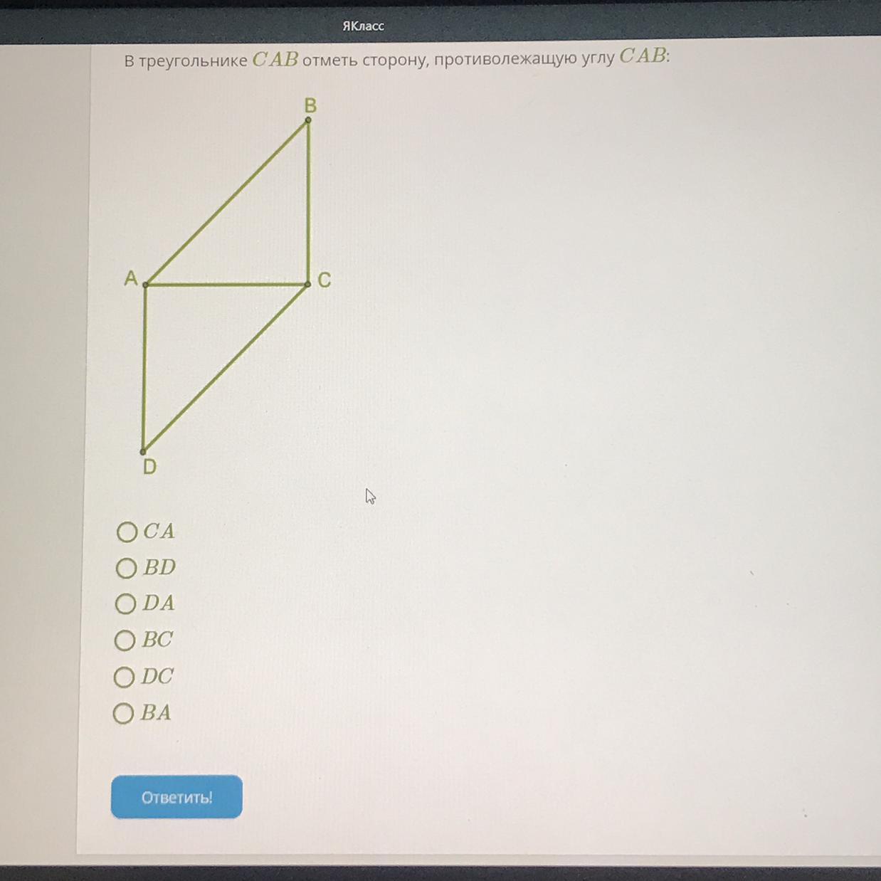 Ответ:Углу САВ противолежит(находится напротив) сторона ВС
