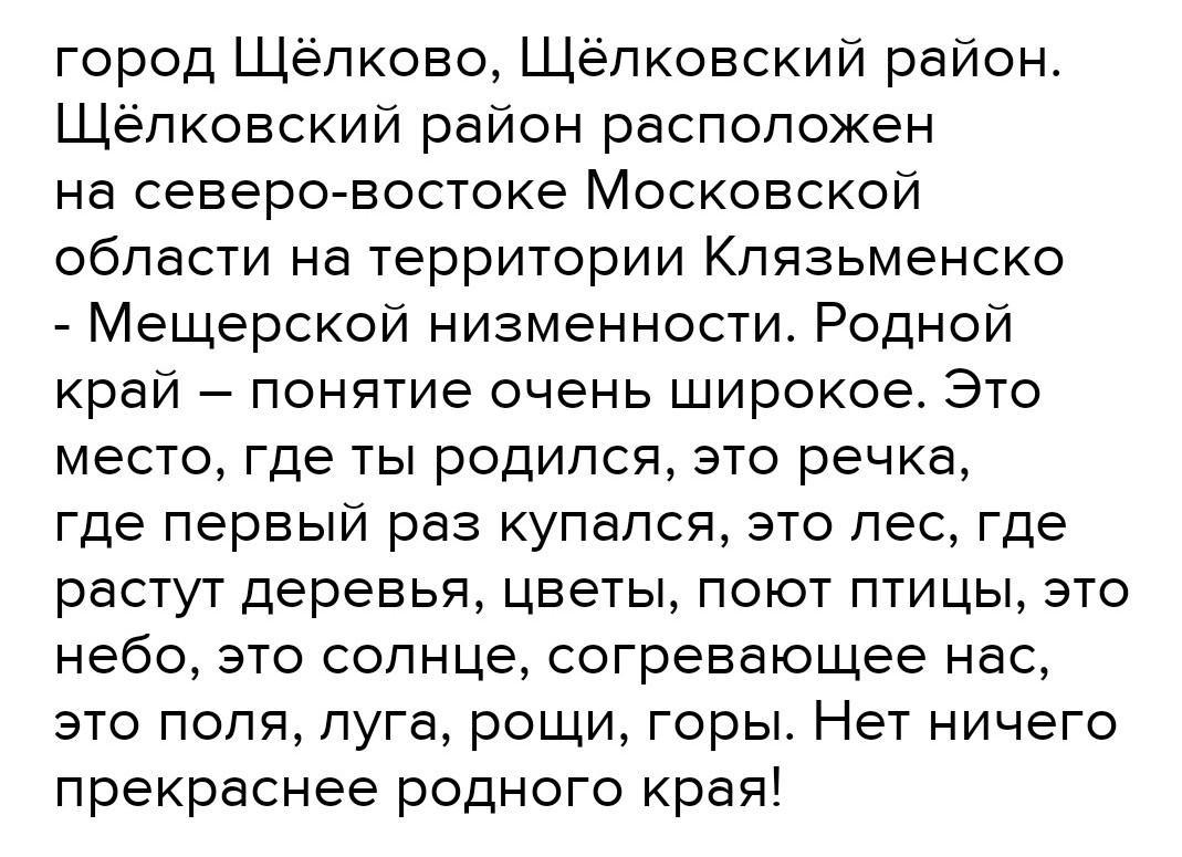город Щёлково, Щёлковский район. Щёлковский район расположен на северо-востоке Московской области на территории Клязьменско Мещерской низменности. Родной край понятие очень широкое. Это - место, где ты родился, это речка, где первый раз купался, это лес, где растут деревья, цветы, поют птицы, это небо, это солнце, согревающее нас, это поля, луга, рощи, горы. Нет ничего прекраснее родного края!