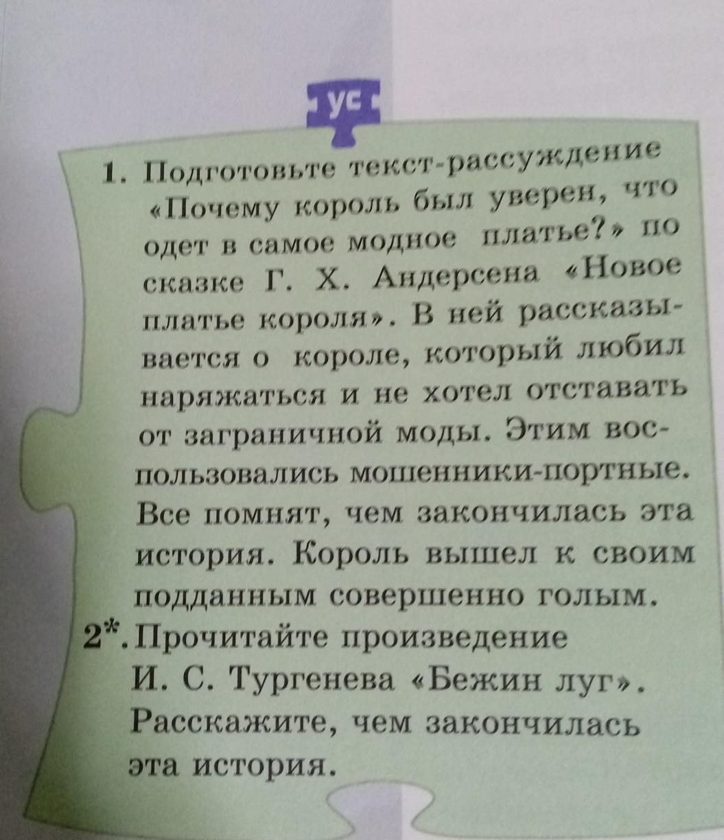 . ус 1. Подготовьте текст-рассуждение «Почему король был уверен, что одет в самое модное платье?» по сказке Г. Х. Андерсена «Новое « платье короля». В ней рассказывается о короле, который любил наряжаться и не хотел отставать от заграничной моды. Этим воспользовались мошенники-портные. Все помнят, чем закончилась эта история. Король вышел к своим подданным совершенно голым.