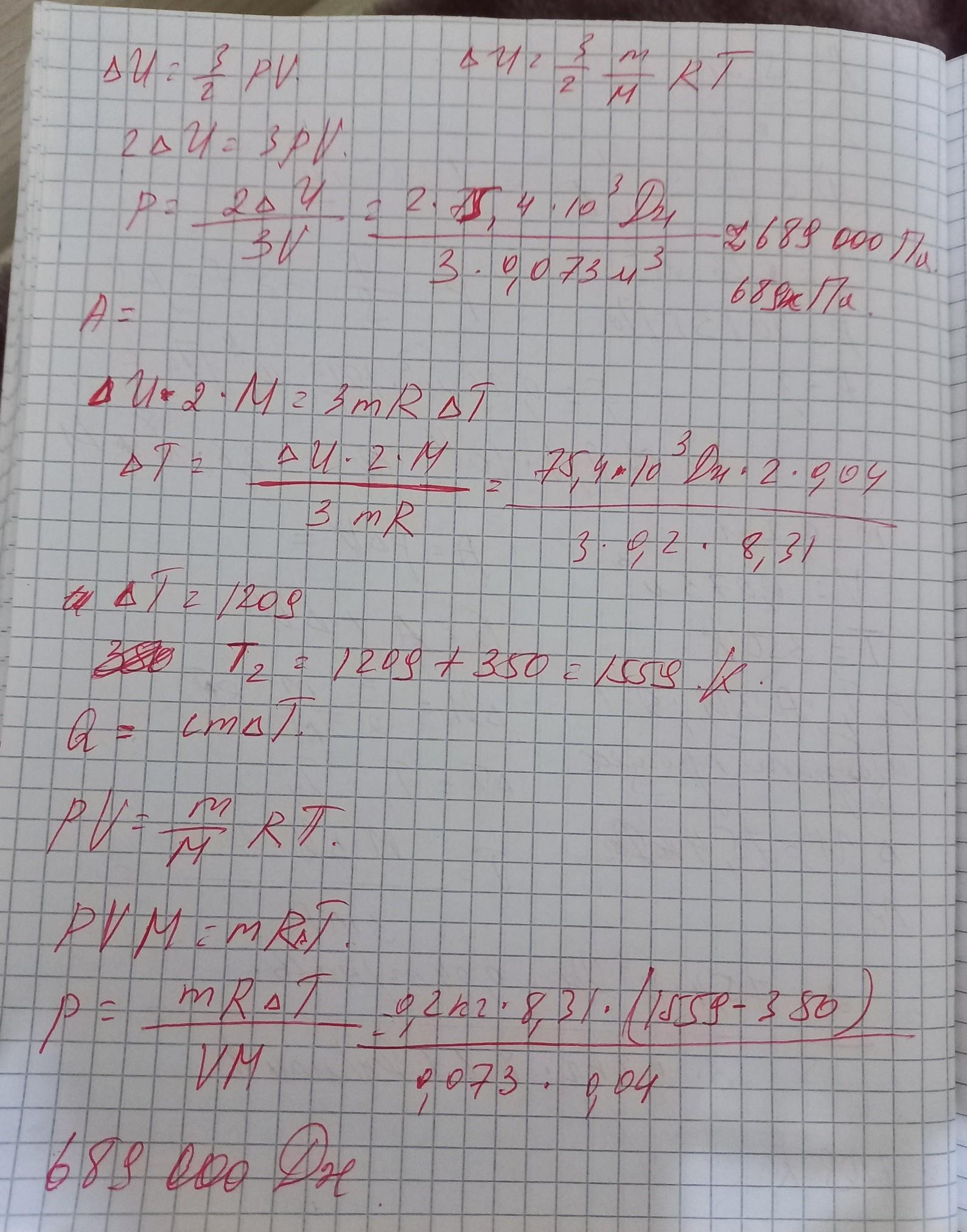 Идеальный газ (аргон) массой 0,2кг при температуре Т1 и давлении р (кПа) занимает объем 0,073 м^3. Внутренняя энергия газа 75.4 кДж. В изобарном процессе газу сообщили ( отвели ) количество теплоты Q . При этом газом совершена работа А, приращение внутренней энергии ΔU, конечная температура 350К.