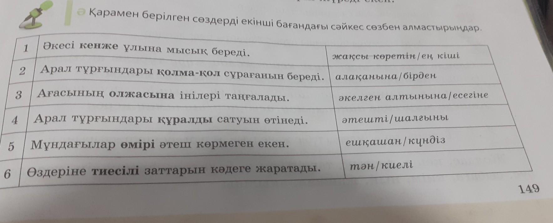 Ә Қарамен берілген сөздерді екінші бағандағы сәйкес сөзбен алмастырыңдар. 1 Әкесі кенже ұлына мысық береді. жақсы көретін/ең кіші 2 Арал тұрғындары қолма-қол сұрағанын береді. алақанына/бірден 3 Ағасының олжасына інілері таңғалады. әкелген алтынына/есегіне 4 Арал тұрғындары құралды сатуын өтінеді. әтешті/шалғыны 5 Мұндағылар өмірі әтеш көрмеген екен. ешқашан/күндіз тән/киелі 6 Өздеріне тиесілі заттарын кәдеге жаратады. 149