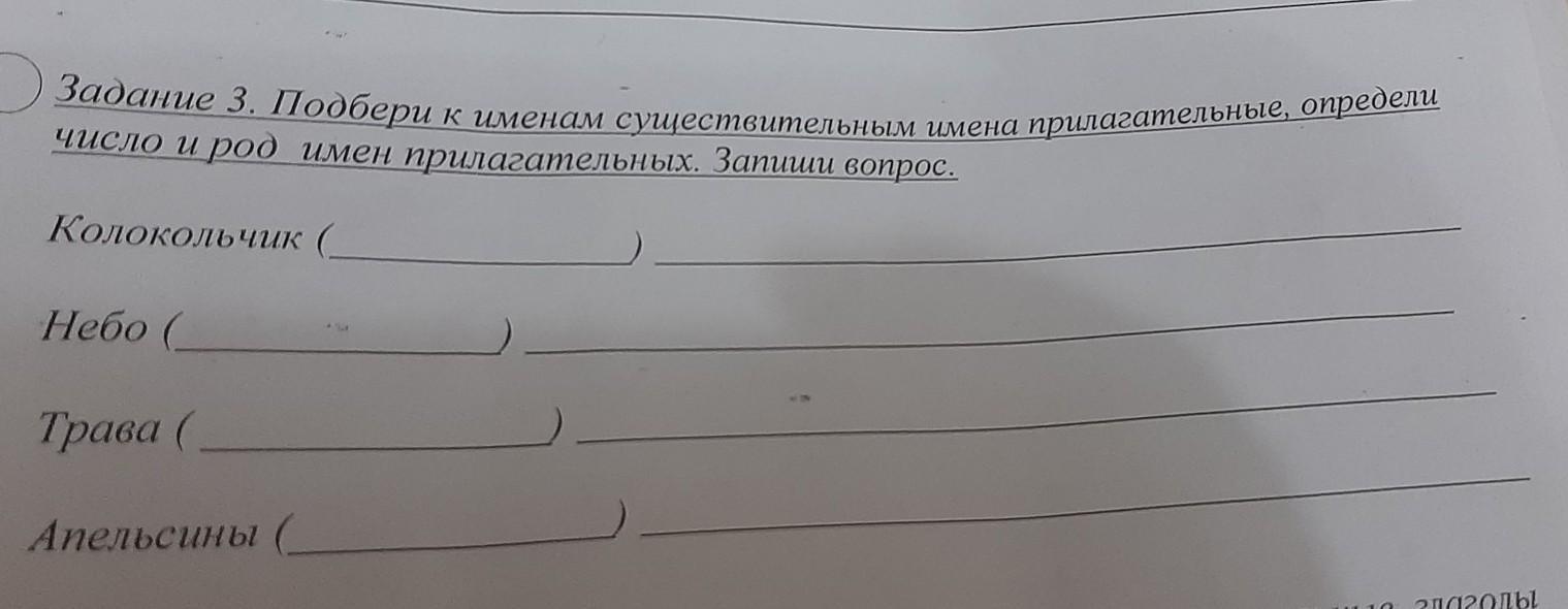 Задание 3. Подбери к именам существительным имена прилагательные, определи число и род имен прилагательных.