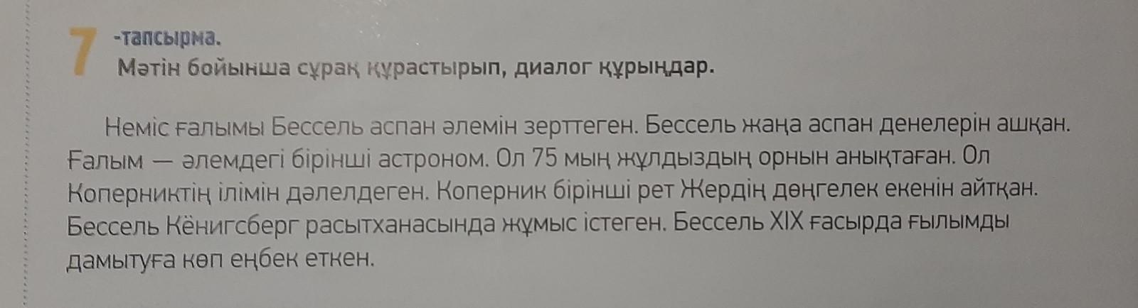 7 тапсырма. Мәтін бойынша сұрақ құрастырып, диалог құрыңдар . Неміс ғалымы Бессель аспан әлемін зерттеген. Бессель жаңа аспан денелерін ашкан Ғалым - әлемдегі бірінші астроном. Ол 75 мың жұлдыздың орнын анықтаған. Ол Коперниктің ілімін дәлелдеген. Коперник бірінші рет Жердің деңгелек екенін айтқан Бессель Кёнигсберг расытханасында жұмыс істеген. Бессель XIX ғасырда ғылымды дамытуға көп еңбек еткен.