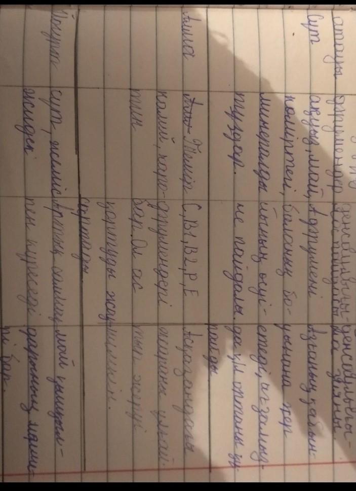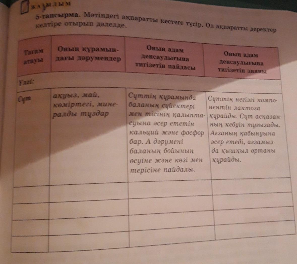 5-тапсырма. Мәтіндегі ақпаратты кестеге түсір. Ол ақпаратты деректер келтіре отырып дәлелде. Taram атауы Оның күрамын- дағы дәрумендер Оның адам денсаулығына тигізетін пайдасы Оның адам денсаулығына тигізетін зияны Cym ақуыз, май, көміртегі, мине- ралды тұздар Сүттің құрамында Сүттің негізгі компо- баланың сүйектері нентін лактоза мен тісінің қалыпта- құрайды. Сүт асқазан- суына әсер ететін ның кебуін туғызады. кальций және фосфор Ағзаның қабынуына бар. А дәрумені әсер етеді, ағзамыз- баланың бойының да қышқыл ортаны өсуіне және көзі мен құрайды. терісіне пайдалы.