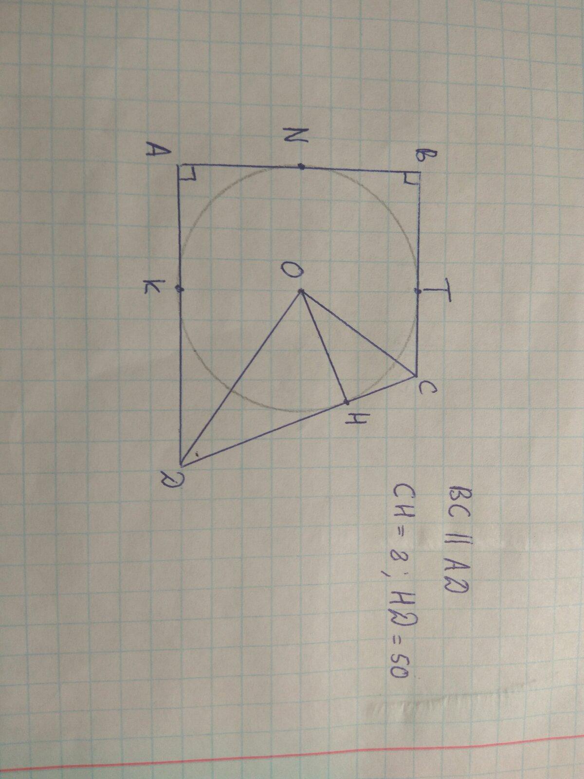 DК = DН и СН = СT как касательные к окружности, проведенные из одной точки. Следовательно, ∆DКО = ∆DНО и ∆CTO = ∆СНО по трем сторонам. В равных треугольниках углы, лежащие против соответственных сторон, равны. Поэтому ∠ОСТ = ∠ОСН и ∠ОDК = ∠ОDН => ОС и OD - биссектрисы. ВС║АD, значит ВСD + ∠АDС = 180° как внутренние односторонние при параллельных прямых и секущей СD. Половины этих углов в сумме равны 90°, следовательно, ∠СОD = 90°.