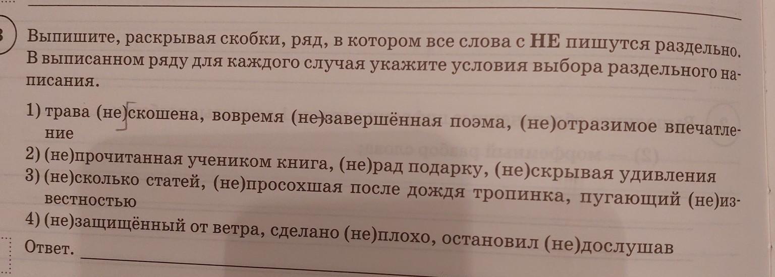 Выпишите, раскрывая скобки, ряд, в котором все слова сHE пишутся раздельно. В выписанном ряду для каждого случая укажите условия выбора раздельного на писания. 1) трава (не)скошена, вовремя (не)завершённая поэма, (не)отразимое впечатле- ние 2) (не)прочитанная учеником книга, (не)рад подарку, (не)скрывая удивления 3) (не)сколько статей, (не)просохшая после дождя тропинка, пугающий (не) из- вестностью 4) (не)защищённый от ветра, сделано (не)плохо, остановил (не)дослушав