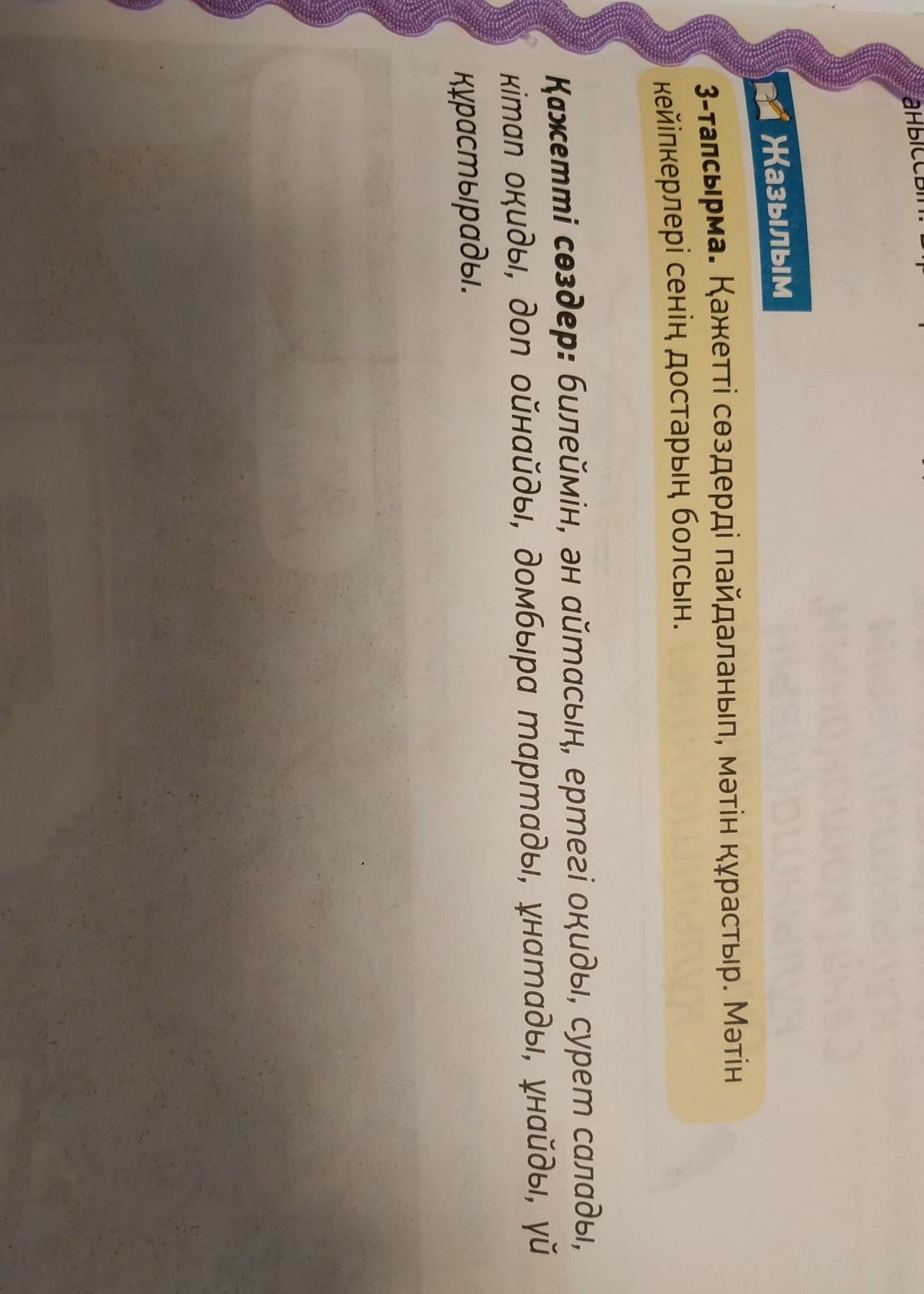 Қажетті сөздер: билеймін, ән айтасың, ертегі оқиды, сурет салады, кітап оқиды, доп ойнайды, домбыра тартады, ұнатады, ұнайды, үй құрастырады. (сделать не большой расказ из этих слов можно добовлять свои слова!) 11 балов быстрее плиз