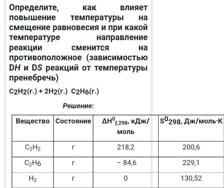 Определите, как влияет повышение температуры на смещение равновесия и при какой температуре направление реакции сменится на противоположное (зависимостью ΔH и ΔS реакций от температуры пренебречь) :