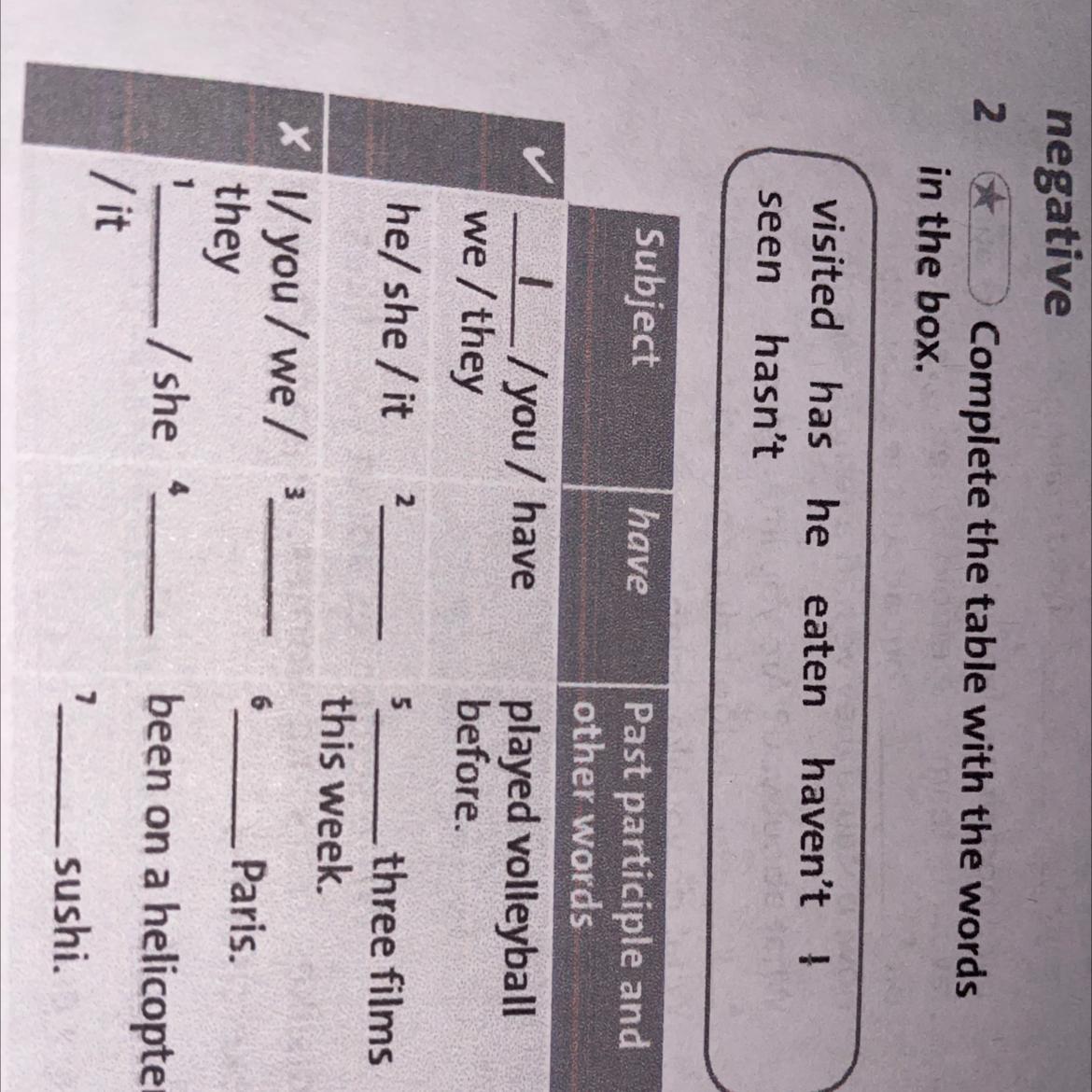 Complete the table with the words in the box. visited has he eaten haven't seen hasn't Subject have Past participle and other words we /they /you / have played volleyball before. he/she /it 2 _ three films this week. !/you /we / they /she 4 _ Paris. been on a helicopter. /it sushi.
