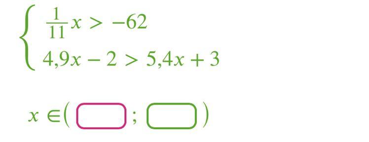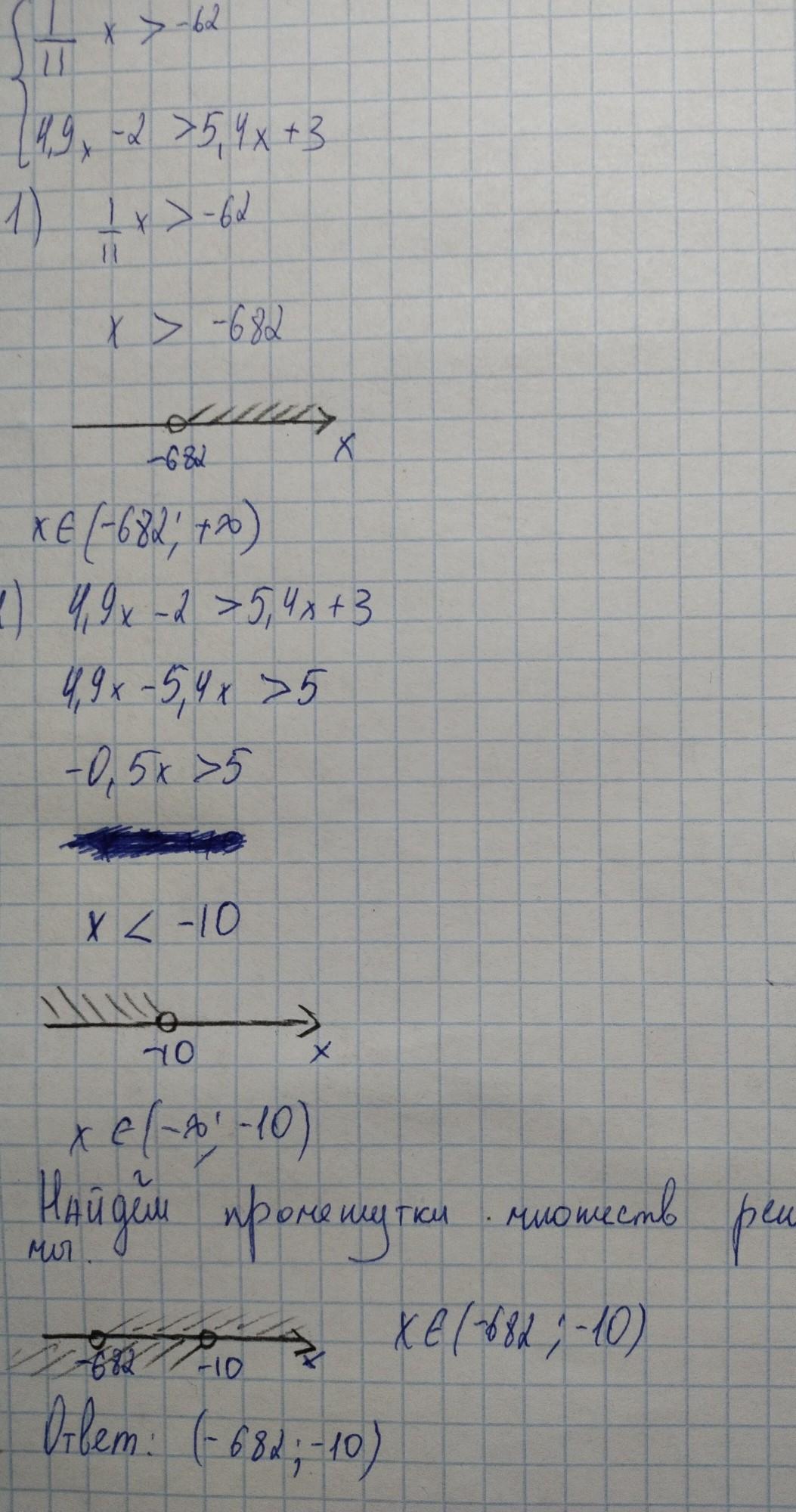 в первом неравенстве делим обе части на 1/11, или умножаем на 11, получаем х>-682; во втором получаем -5>(5.4-4.9)х; -5>0.5х;х<-10