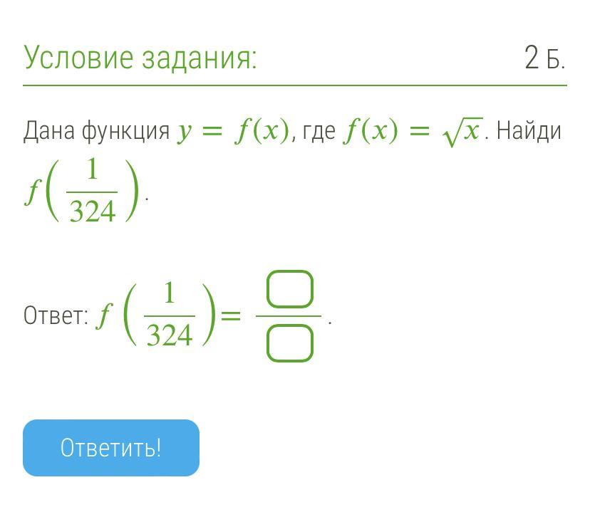 \displaystyle f(x)=\sqrt{x}\\\\f\bigg(\frac{1}{324}\bigg)=\sqrt{\frac{1}{324}}=\frac{\sqrt{1}}{\sqrt{324}}=\boxed{\frac{1}{18}}