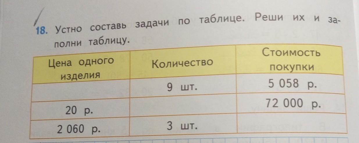 18. Устно составь задачи по таблице. Реши их и за полни таблицу. Количество Цена одного изделия Стоимость покупки 5 058 р. 9 шт. 72 000 р. 20 р. 2 060 р. 3 шт. 16 2) 2 32