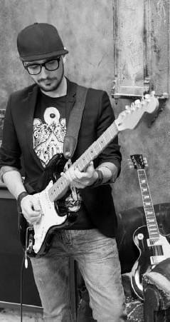 Перед нами черно-белая фотография. Это портрет. На нем мы видим молодого человека с электрогитарой. Он похож на рок-музыканта. В данный момент он пробует играть на своей новой гитаре. Гитар у него несколько, одна из них тоже находится в кадре. У музыканта очень привлекательная внешность. Он носит усы и небольшую бородку. По-видимому, он немного близорук, поэтому на нем очки в модной оправе. В одежде преобладают темные цвета: темный пиджак, черная футболка, темная бейсболка на голове. Ярким пятном выделяется на фото принт на груди. Он кажется мне интересным музыкантом, который серьезно относится к делу, которым занимается.