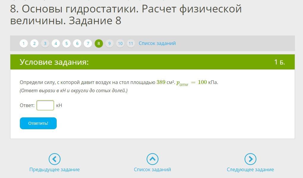 Определи силу, с которой давит воздух на стол площадью 389 см². pатм = 100 кПа.