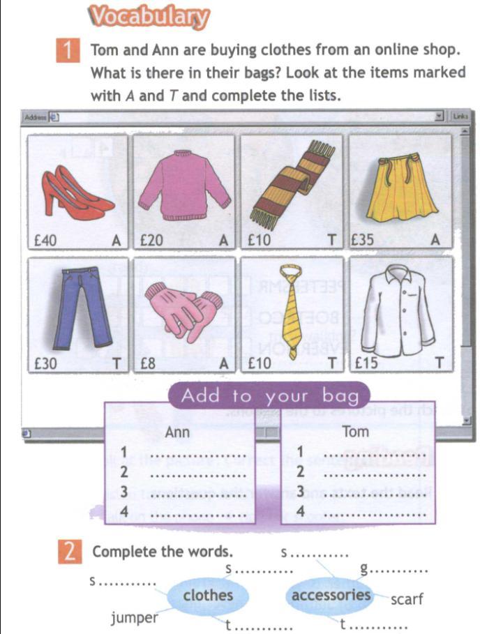 у Анны в корзине туфли , кофта , шарф , юбка а у Тома в корзине джинсы, перчатки, галстук , рубашка. на английском shoes, jacket , scarf , skirt, jeans, gloves, tie, shirt