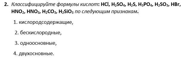 1. кислородсодержащие: H2SO4, H3PO4, H2SO3, HNO2, HNO3, H2CO3, H2SiO3
