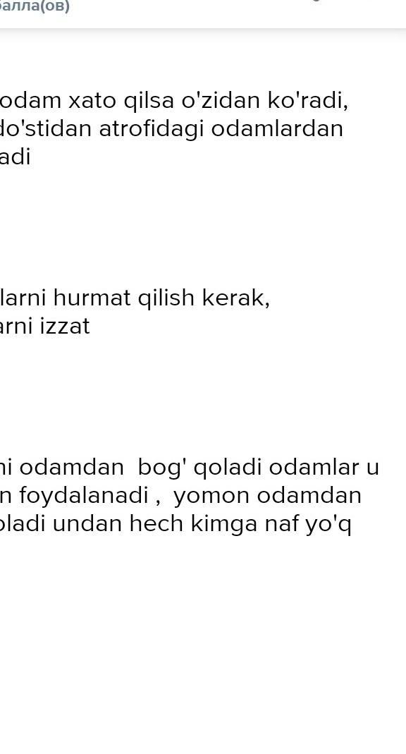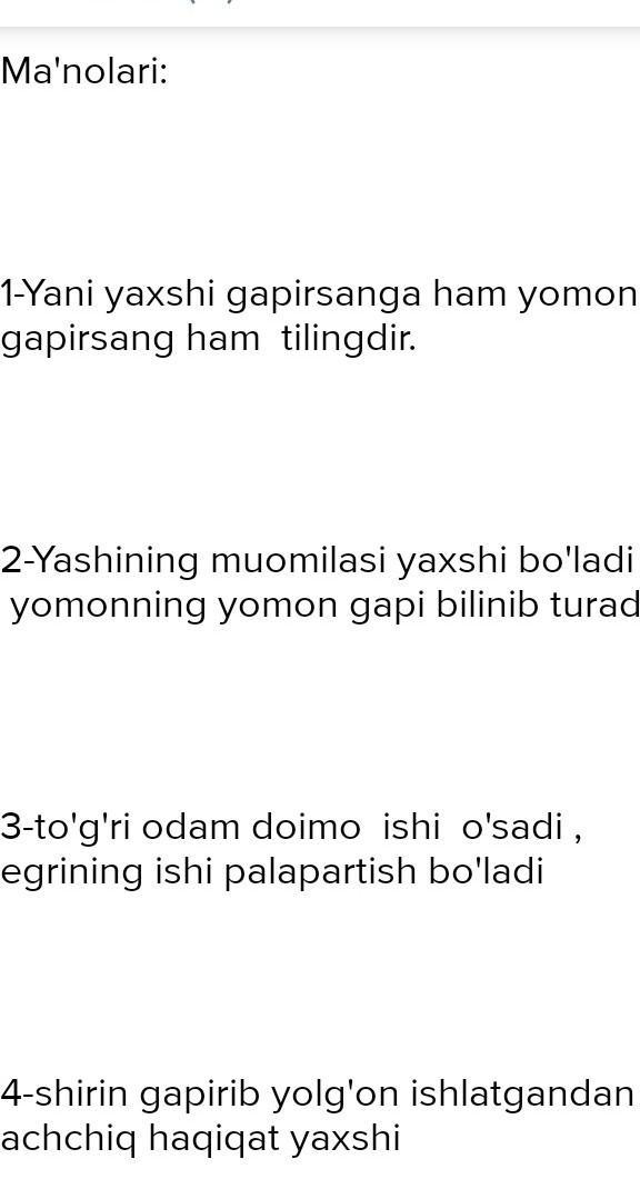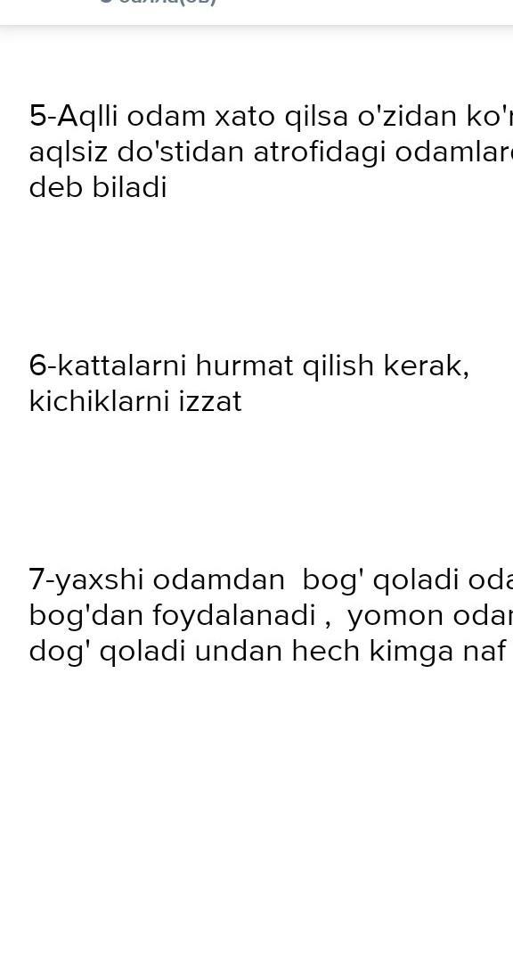 1-mashq. Berilgan gaplarni yozing va ona tilingizga tarjima qiling. Toʻldiruvchilarni topib, ifodalanishini tushuntirib bering. 1. Aqlli oʻzini ayblar, aqlsiz – doʻstini. 2. Yaxshiga qora yuqmas, yomonga el boqmas. 3. Onam ularga toʻrttadan non berdilar. Koʻrganni eshitgan yengibdi. 5. U bizni sayohatga taklif qildi. 6. Uning tepa sochi tikka boʻlishidan qoʻrqdi. 7. Sen meni gapga chalg'itma.