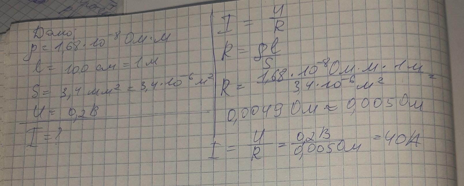 1. Проводник сделан из меди, имеет длину 100см и площадь поперечного сечения 3,4 мм? Проводник включен в цепь постоянного тока напряжением 0,2 В. Найдите силу тока. (Удельное сопротивление определите по таблице). [4]